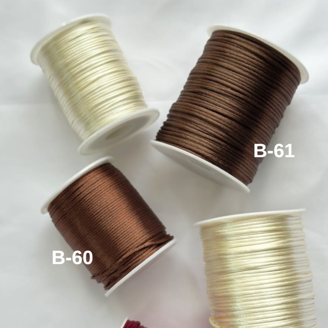 サテンという言葉の通りさらりとして艶のある表面なので、少し滑りやすいのも特徴の一つです。結びに使用する場合は、目の詰まった結びにする or 一目一目に接着剤やグルーガンなどを施すと美しく仕上がります。